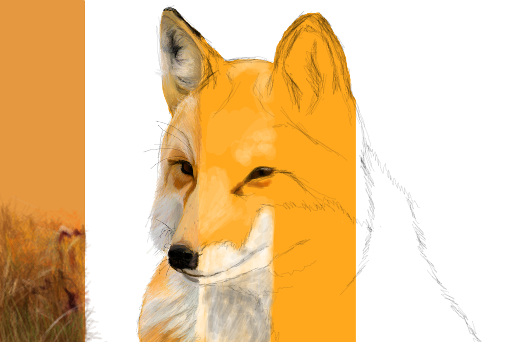 4 этап. Создаю 4 слой и оставляю его на первом месте. Начинаю рисовать частями, прорисовывая каждую деталь. На 3 слое также подбираю нужный цвет. Частями стираю ластиком 1 слой. Первое, что я рисую, это глаза и нос, иногда рисую их на отдельном слое, чтобы случайно не испортить. Только очень сложно подбирать нужные цвета с фото, жаль здесь нет строки для написания кода нужного мне цвета, наверное, было бы легче.