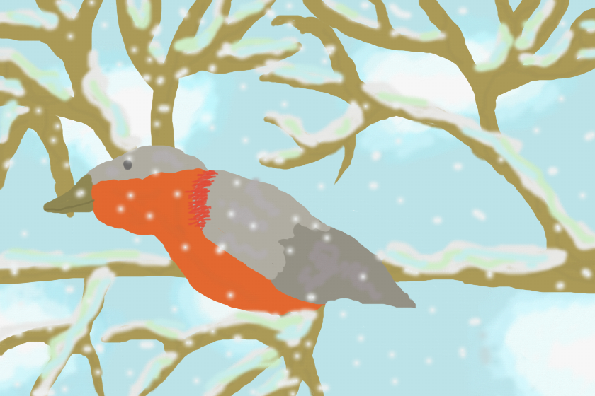 Снегирь во время снегопада сидит на заснеженной ветке.