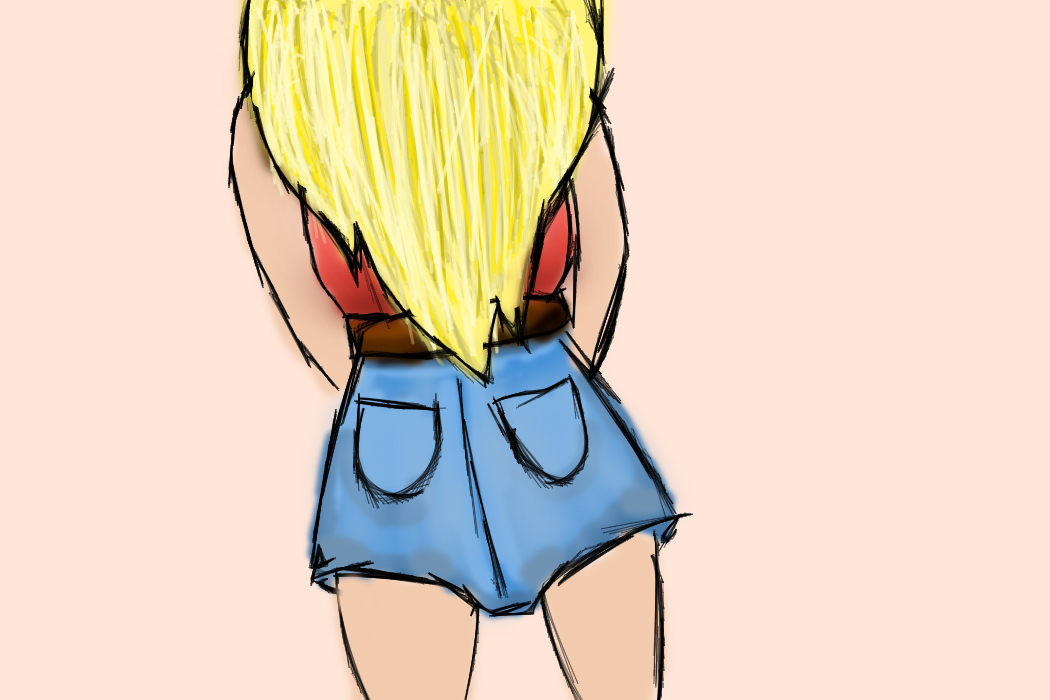 выглядит так,что она стоит к нам лицом, закинув волосы вперед. Все из-за талии, которая похожа на грудь