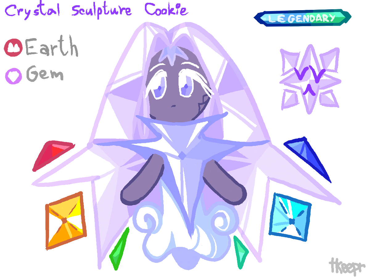 фанатскую печеньку зовут Crystal Sculpture Cookie (Печенье Кристальная Скульптура), она хранитель, также как и другие легендарные печеньки, её стихия - земля. эта печенька живёт глубоко в подземельях и в скрытом городе под землёй. она отвечает за защиту земель эрзбрэда и жизненного порошка на землях печенек, поэтому её силы распространены по всем континентам, где живут печеньки. (¬‿¬)