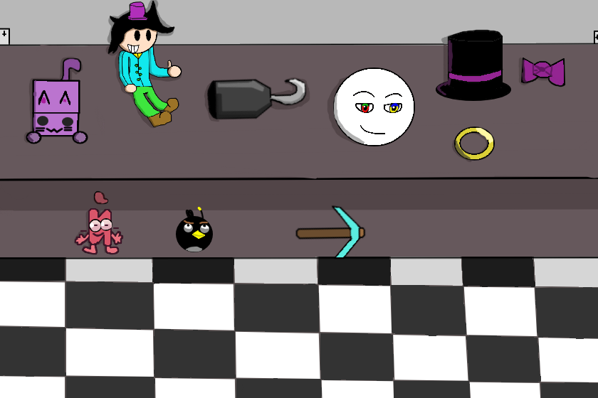 вижу крюк Фокси, шляпу и гластук-бабочку Фредбера, Нептуна (ютубера), алмазную кирку из Майкрафта, живую букву (ИНМТ), Сердитую Птичку (бомбу)