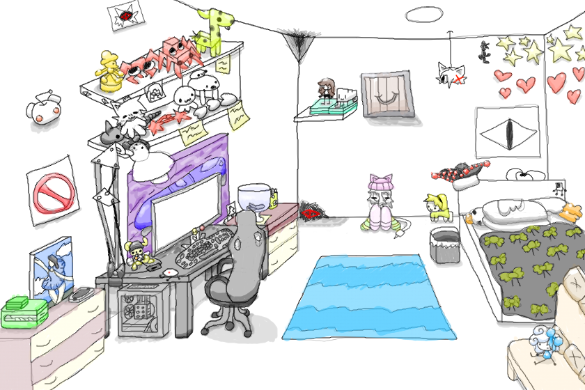 Изначально я хотел нарисовать псих комнату с мини посхалками на своих друзьянов, в итоге нарисовал это, мне нравится(Это арт почти правда)
