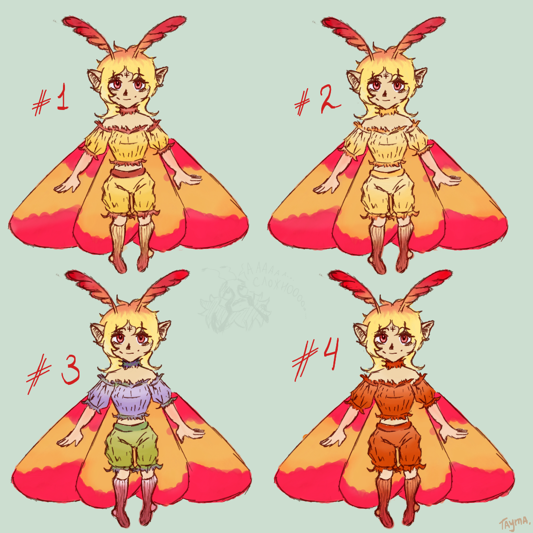 Набросала 4 варианта с цветом одежды. Ну, первая почти такая же как была в предыдущей каляке, добавила только небольшой градиентик на одежде. 3 варик мне кажется не подходит по цвету конкретно этой девчуле, но уже не стала чето выдумывать (все равно это получается у меня плохо, как видите\). А вам какой варик нравится?